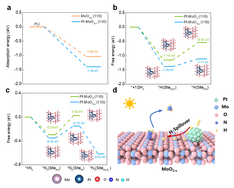 综上所述,本次工作通过双活性位点的协同效应,建立了一种高效的光催化氨合成策略。实验和理论证明,该策略在可见光照射下增强氮的氢化和氢的溢出。低价态Mo物种作为化学吸附氮的活性位点,为氮分子提供了更多的光电子能量,从而增强了氮气还原能力。负载的Pt纳米颗粒助催化剂可以引发氢溢出,促进氮氢化,进一步增加Mo(V)的活性位点,并形成肖特基势垒以高效传递光激发电子。该研究为环境条件下的光驱动氮还原提供了一种前景广阔的方法,并揭示了协同效应的重要性。
