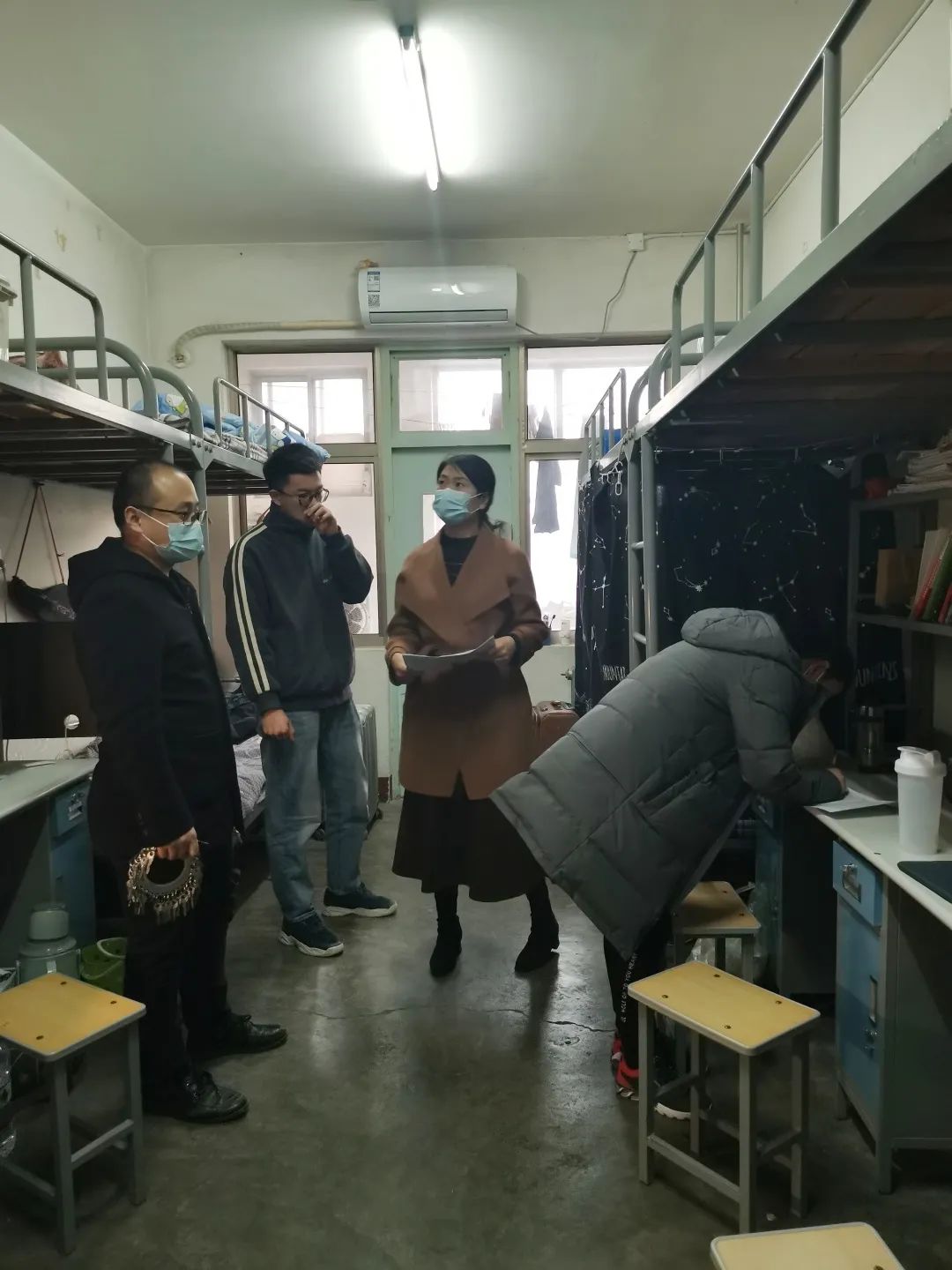 宿舍文明方面,重点检查长流水、长明灯、长转扇,宿舍人走不关台灯,人走不关电脑;水电设施损坏不及时报修。宿舍卫生方面,重点检查宿舍地面,墙壁墙角,门窗玻璃;阳台、卫生间、洗刷间、电风扇、暖气片;床底脏乱、床铺不整洁、书桌书架不干净等问题,并分类登记。边检查督导边对同学们进行文明修身教育,督促学生增强宿舍安全意识,认真落实学生宿舍体温一日三检和通风消杀,并做好记录,确保宿舍安全隐患筛查工作落到实处,不走过场不留死角。